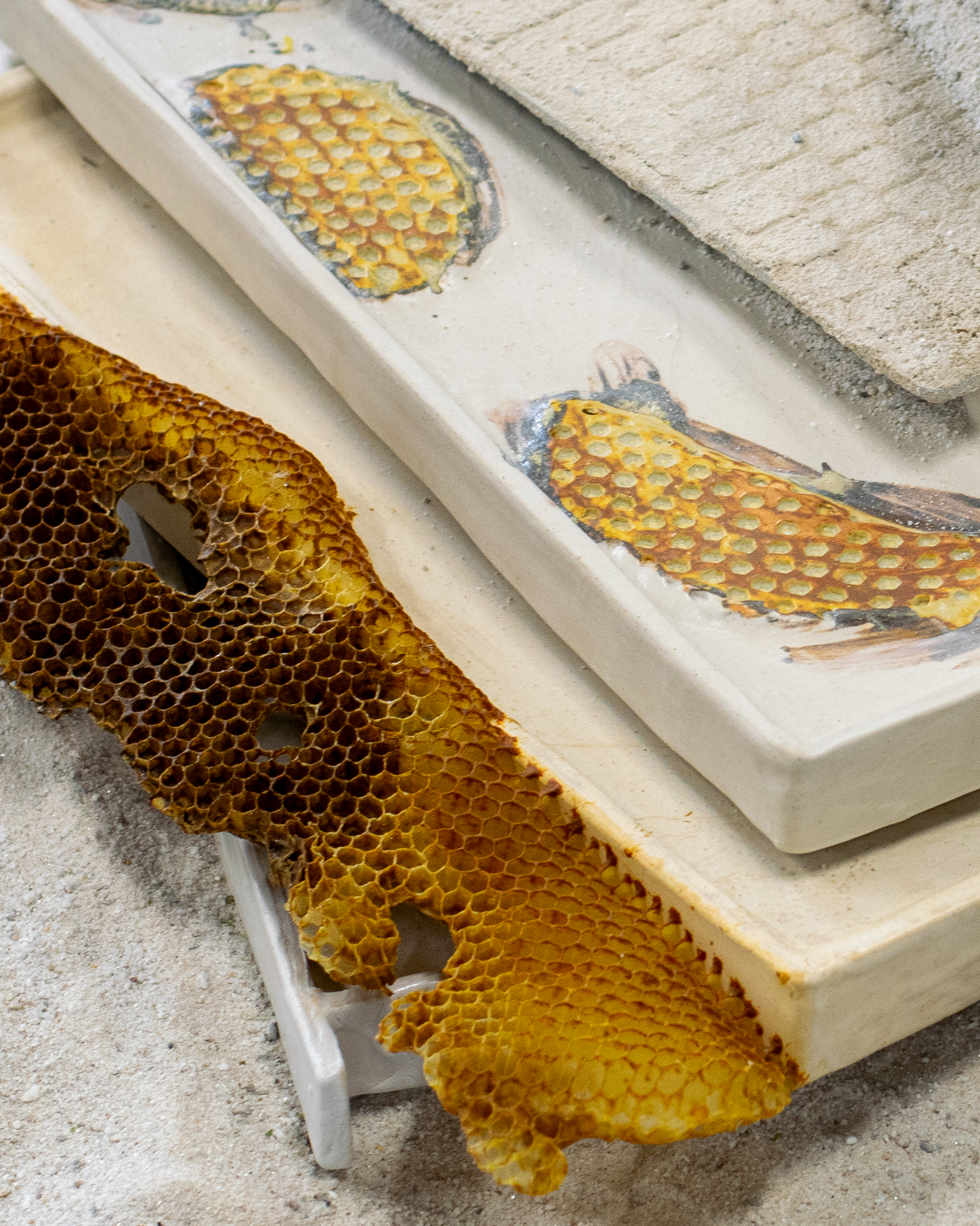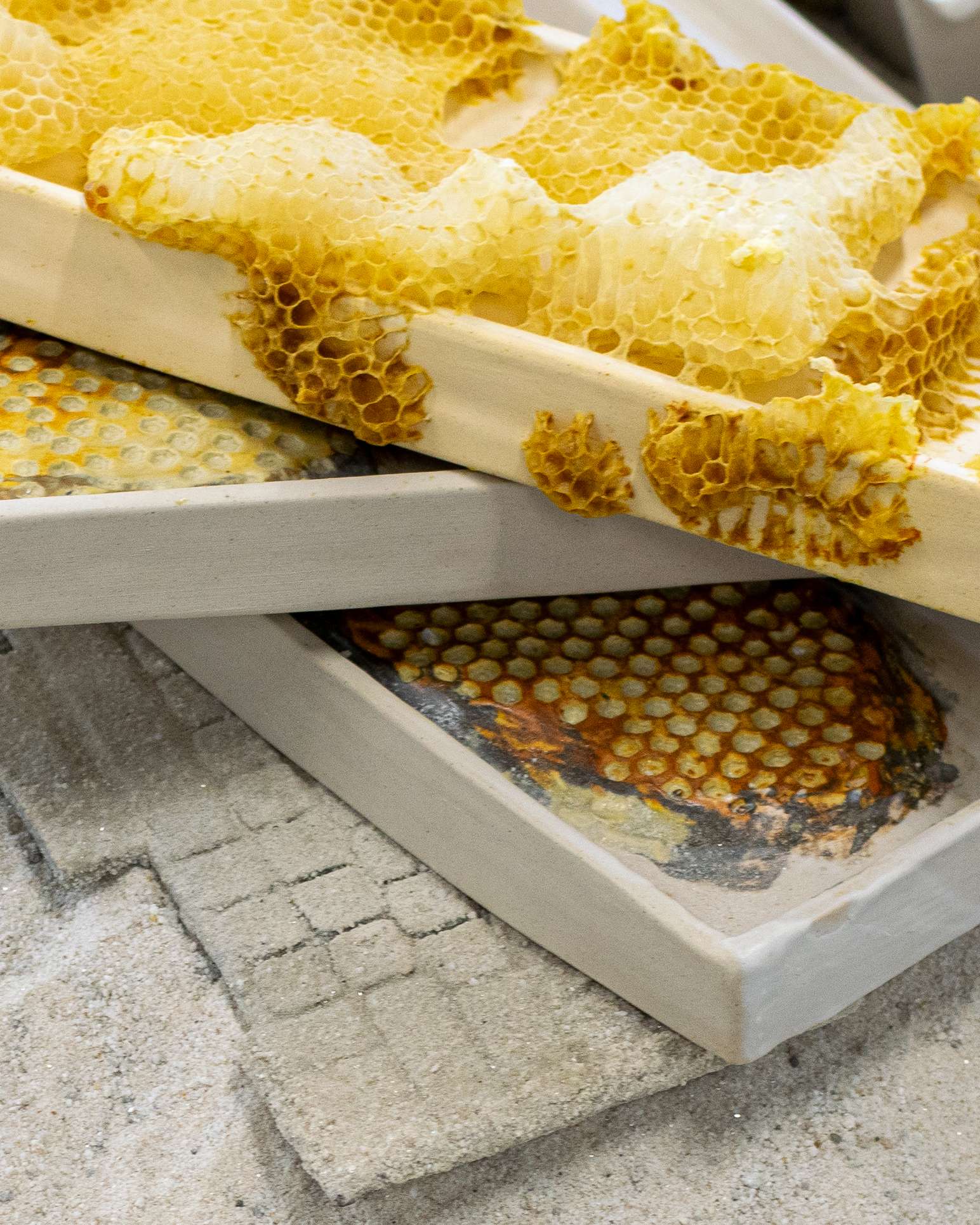 The second iteration of this work introduced interspecies collaboration. Luke Howard, a beekeeper and the founder of the Bee Collective, took parts of my original installation. He placed them in an active hive where honeybees then built honeycomb structures on top. An exhibition presented the resulting installation to raise awareness for pollinators. I consider the bees to be co-authors of this piece.