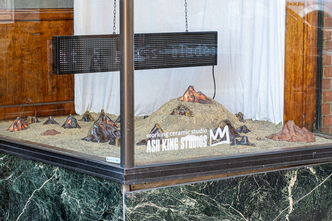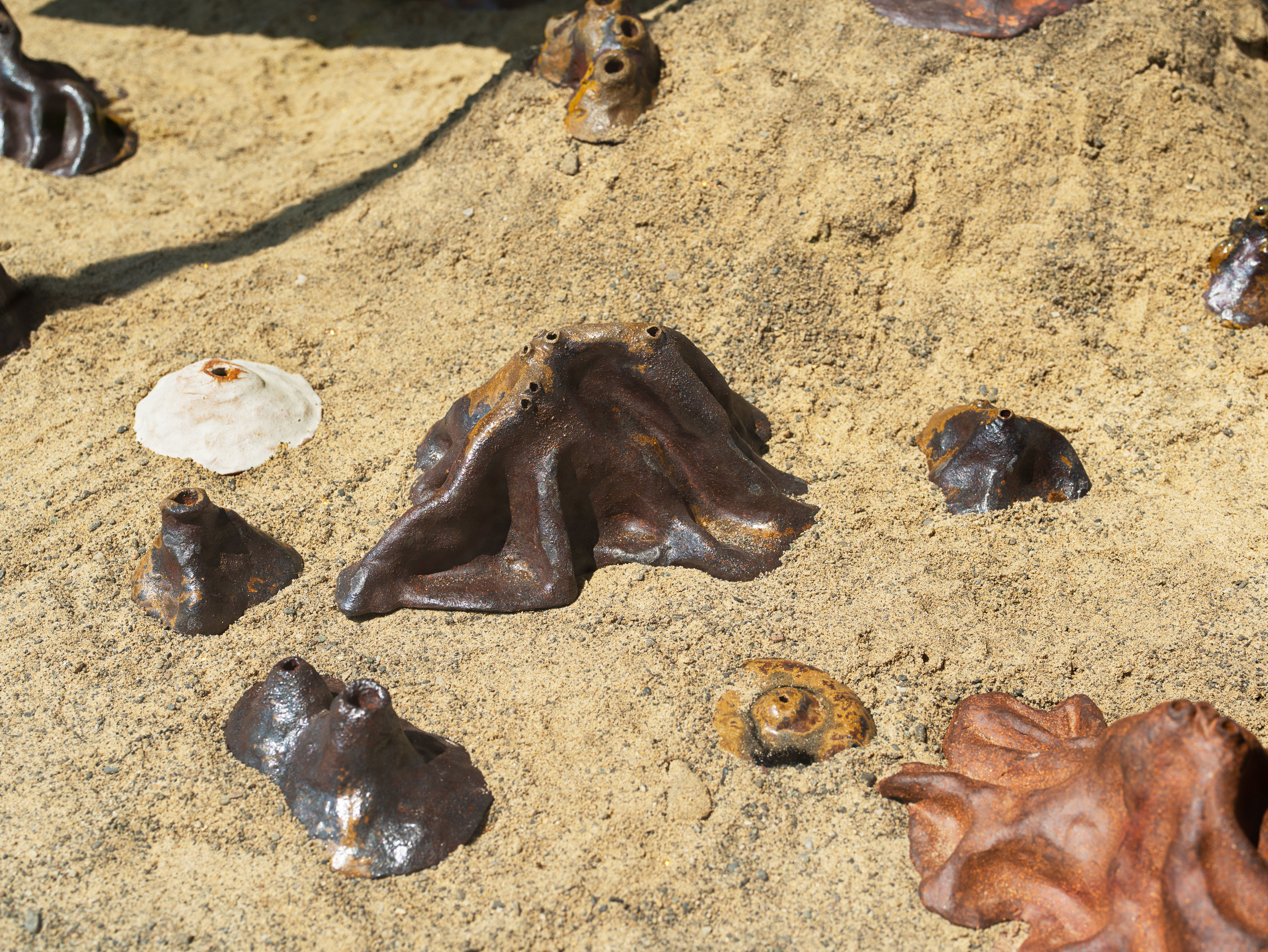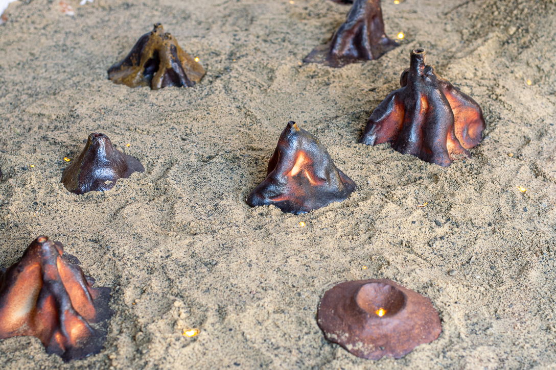 Wood fired ceramic ant hills, LED sign, sand, string lights