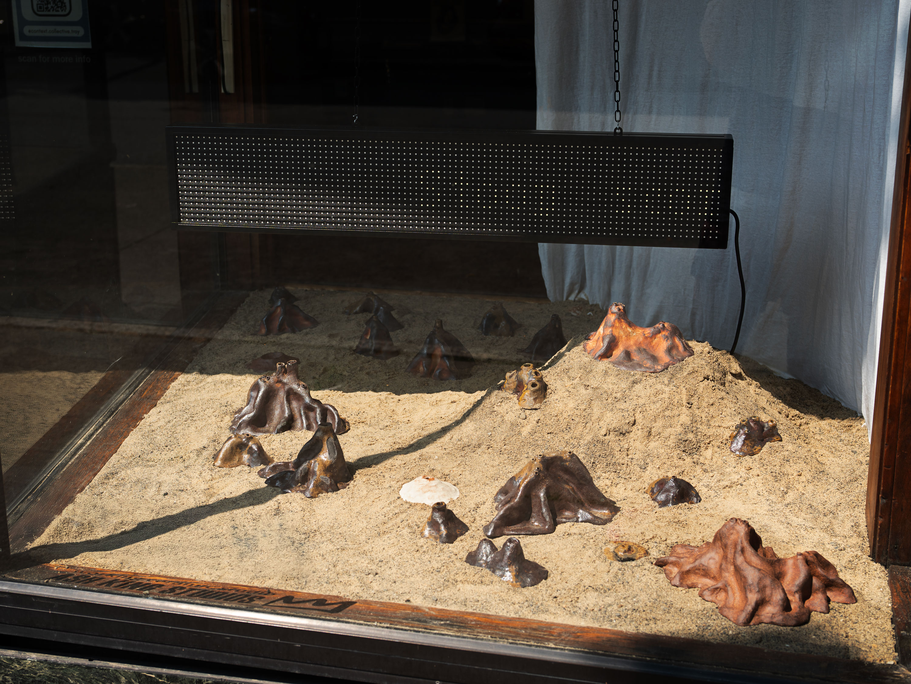 The ceramic ant hills and glowing digital ants were installed in a storefront as part of an artist-organized exhibition at Context Collective in Troy, NY.